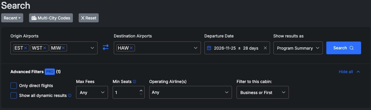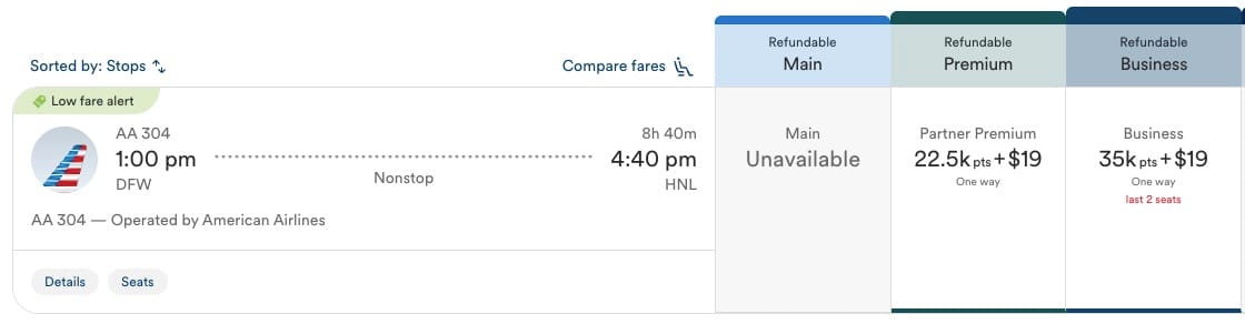 I saw some great examples like DFW â Honolulu for 35,000 miles in business.
